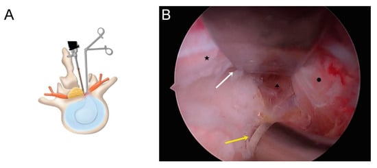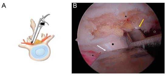 (A) Schematic illustration of ipsilateral decompression and discectomy. (B) Operative field for discectomy with nerve protection (white arrow: dural protector; yellow arrow: coagulation electrode; ★: thecal sac; ▲: disc; ●: traversing root).
