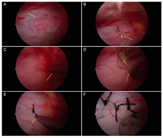 Endoscopic suture using the specially designed pusher. (A) An incidental thecal sac lesion during durotomy is shown by the yellow arrow. (B) The 4:0 silk needle used to suture both lateral margins, including the needle holder, shown by the yellow arrow. (C) The silk suture used is crossed to form a knot (yellow arrow). (D) The pusher is used to strengthen the knot to obtain a watertight suture (yellow arrow). (E) The ends of the silk suture are cut using micro-scissors (yellow arrow). (F) The completed water-tight suturing is shown.