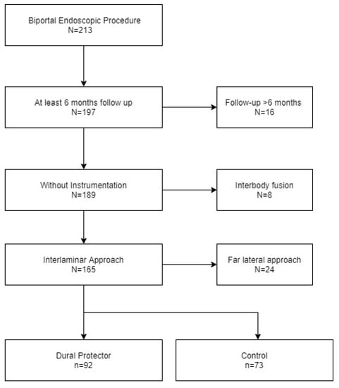 Over the 12 months of the study period, 213 patients underwent PBES for lumbar decompression. Among these, the following were excluded: 16 lost to follow-up at <6 months; 8 who underwent biportal endoscopic fusion; and 24 who were treated using a far lateral approach. After exclusion of these cases, our analysis was based on the data from 165 patients treated for an intracanal pathology by PBES. (Figure 5) Among these 165 cases, 92 underwent PBES with a dural protector (experimental group) and 73 without (control group). Demographic and baseline data of the two groups are summarized in Table 1 No significant difference in the distribution of age, sex, preoperative medical conditions, and MRI grading was observed between the two groups. Discectomy was more frequently performed in the experimental group (29.70%) than in the control group (1.21%) (p < 0.01). Operative time was significantly longer in the experimental group (81.52 ± 48.75 min) than in the control group (60.41 ± 25.51 min) (p < 0.01).