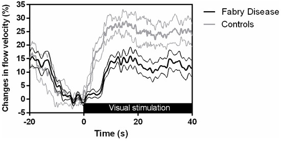 Group-averaged evoked systolic cerebral blood flow velocity (CBFV) responses during visual stimulation with flickering checkerboard. Male healthy controls are represented by thick lines and male Fabry disease patients by black lines. Thinner lines represent standard deviation.