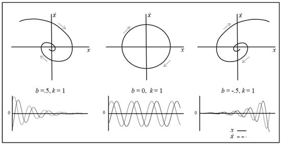 Three examples of how the behavior of Equation (1b) can evolve over time for different parameter settings are displayed in Figure 2 using both state space trajectories and time-series graphs. For these examples, k = 1, = (, ) = ( x, ) were set to arbitrary initial conditions and the damping parameter, b, was set to 0.5, 0, and −0.5 from left to right, respectively. The behavior exhibited in the bottom left of Figure 2 corresponds to the terrestrial scenario in which the position of the system being modelled (i.e., object, body, or end-effector) is pulled away from its resting position at x = 0, and then oscillates back and forth at a smaller and smaller amplitude until it eventually returns to x = 0 and comes to a stop. In this case, the parameter b acts like a friction force, damping out the potential energy that results from extending or compressing the spring or stiffness force, with the state x* = (x, ) = (0, 0) corresponding to a stable fixed-point attractor. The opposite behavior is observed in the bottom right of Figure 2, where b = −0.5. Here, the negative value of b results in a kind of a negative-friction force, with the system oscillating away from x* = (x, ) = (0, 0). Hence, the state x* corresponds to an unstable fixed-point repeller. Finally, when b = 0 (bottom middle of Figure 2), the system simply oscillates harmonically at an amplitude equal to the initial position of the mass when released (i.e., the value of ). In this case, x* is neither stable nor unstable and is therefore considered to be neutrally stable.