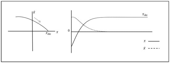 where the new term specifies the preferred position or goal state for the system. Moreover, let the system be critically damped (or overdamped) such that, when x is moved away from , the system returns to without any oscillation. This is illustrated in Figure 3 (for k = 1, = (, ) = ( x, ) ) set to an arbitrary initial condition, set to an arbitrary desired value and the damping parameter, b, set to 1.8), such that we can use this simple goal-directed mass–spring systems (i.e., Equation (2)) to model human end-effector trajectories, including, for example, the movement trajectories exhibited by human agents during route navigation tasks [], as well as during reaching and object movement tasks (e.g., [,]).
