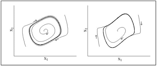 such that the behavior of this system is also best visualized in a 2D state space. Example state space trajectories are displayed in Figure 4, using a range of different initial conditions when b and k = 1, and c = 0.5 and 1. As can be discerned from Figure 4, for any initial state, the system’s trajectories always converge towards and moves around a specific closed orbit, the limit cycle attractor. That is, if the system’s initial state lies inside the orbit of the limit cycle, the state of the system gradually spirals out towards the stable limit cycle trajectory. Similarly, if the system’s initial state lies outside the orbit of the limit cycle, the system spirals in towards the stable limit cycle trajectory.