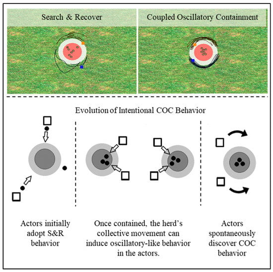 Shepherding behaviors and task space. (top) example of search and recover (S&R) and coupled oscillatory behavior (COC) (top right), (bottom) illustration depicting the interaction evolution that may scaffold COC discovery. See text for more details.