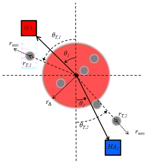 which is similar to Equation (2) and where and correspond to the velocity and acceleration of HA-i’s radial distance, respectively, is the radial distance of the farthest TA on HA-i’s side of the game field, and is a fixed parameter that specifies HA-i’s minimum preferred radial distance from a TA during shepherding to ensure repulsion towards the goal. In short, Equation (6) operates to reduce the radial distance of HA-i with respect to the radial distance of the currently pursued TA, (i.e., the farthest TA from the containment region HA-i’s side of the task field). The coefficients and correspond to the dampness and stiffness parameters, which vary the rate with which r converges to .