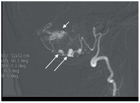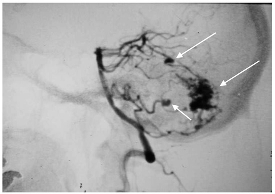 18]. Potentiated hemodynamic stress and associated developmental inferiority of a vessel, as well as the influence of angiogenetic factors upon vessels produced by malformation, are usually considered to be the cause of this coincidence. An aneurysm on the parent vessel may occur either on the proximal or distal segments. The therapeutic strategy after SAH is to firstly exclude the source of hemorrhage from circulation. In microsurgery, once the malformation is excluded from circulation, an increase in pressure in the parent artery occurs, thus increasing the risk of aneurysm rupture. In gradual obliteration of the malformation using endovascular therapy or gamma-knife in some types of proximally located aneurysms, their regression can be anticipated as a result of removal of the hemodynamic stress brought about by subsequent gradual decrease of blood flow due to malformation shunts.
