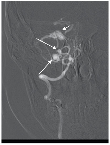 Figure 7). The patient underwent an operation, and AVM was successfully resected with both aneurysms clipped. The control angiogram showed good result of the treatment (