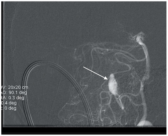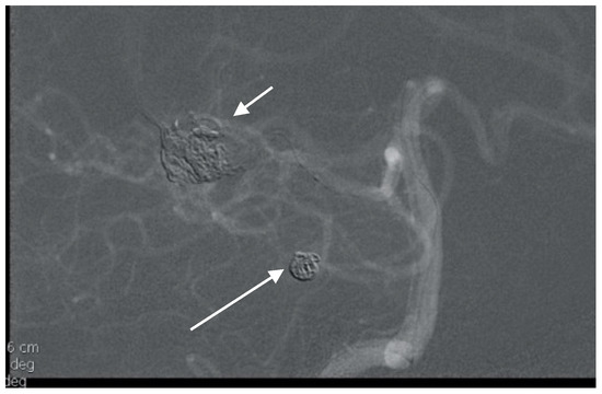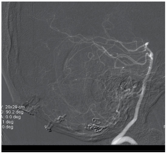 Figure 9). Endovascular treatment was indicated, and successful Onyx embolization of AVM and coil embolization of the aneurysm was performed (