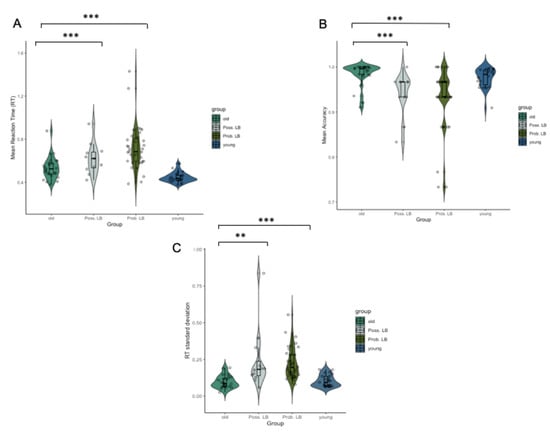 3.2. Mean RT, Accuracy and Variance Differences between Older Versys Younger Controls and between Older Controls and MCI-LB Groups