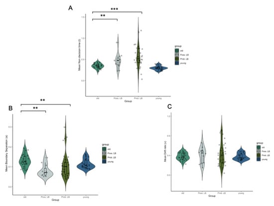 Post-hoc Mann–Whitney U tests showed significantly lower boundary separation values in both possible MCI-LB (U = 53, pcor = 0.004), and probable MCI-LB (U = 240, pcor = 0.009) in comparison to older adults. Moreover, greater non-decision times were observed in possible MCI-LB (U = 56, pcor = 0.005), and probable MCI-LB (U = 125, pcor ≤ 0 0.001) in comparison to older adults. In addition, no significant differences in boundary separation value (pcor = 0.61) and non-decision time (pcor = 0.40) were observed between possible and probable MCI-LB. Mann–Whitney U tests also showed significant differences in variances between drift rate, non-decision time and boundary separation values between older adults, possible MCI-LB and probable MCI-LB groups (drift: U = 23.5, pcor < 0.001; non-decision: U = 444, pcor ≤ 0.001; boundary: U = 420, pcor < 0.001). Additionally, Levene’s test of variance showed significantly greater variation in non-decision time (F (2, 69) = 8.41, p < 0.001), boundary separation (F (2, 68) = 3.26, p = 0.041), and drift rate (F (2, 71) = 9.809, p < 0.001) between control participants and the probable MCI-LB group (Figure 3).