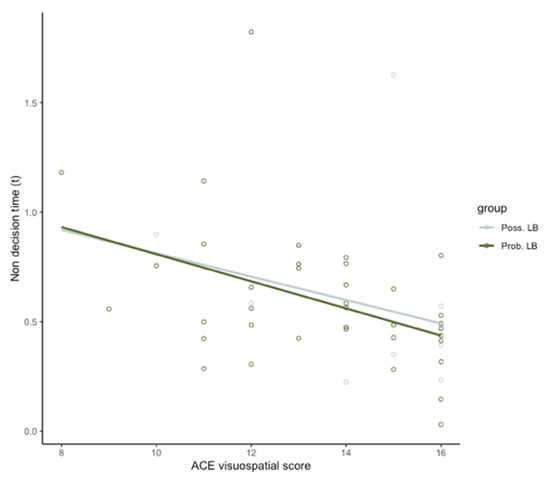 Non-decision time (t) is negatively related to scores on the Addenbrooke’s Cognitive Exam (ACE) Visuospatial subscale in mild cognitive impairment (MCI-LB) groups (adj R2 = 0.129, beta = −0.333, p = 0.014).