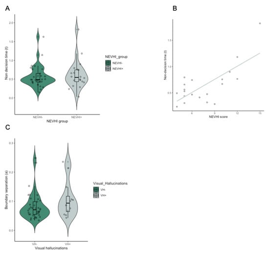To further investigate the relationship between visual hallucinations (VH) and drift diffusion parameters, group comparisons between those patients with a higher NEVHI score (NEVHI+), and those with a low NEVHI score (NEVHI−) were carried out. There was a significant difference in non-decision time between the NEVHI+ and NEVHI− group (U = 183, p = 0.024). Boundary separation (p = 0.416) and drift rate (p = 0.476) did not differ between groups. Finally, Spearman’s Rho correlation showed a significant positive relationship between NEVHI score and non-decision time in MCI-LB patients in the NEVHI+ (rho = 5.412, p = 0.013) (Figure 5). However, as the NEVHI score is not a direct indicator of the presence of visual hallucinations, we also carried out a comparison between those patients with the presence of complex VH (VH+), as rated by a clinical panel—as per Donaghy et al. [24]—in accordance with 2017 DLB criteria [41], and patients with absence of complex VH (VH−). VH+ and VH− patients did not show any significant difference in non-decision time (p = 0.625) or drift rate (p = 0.659), but VH+ patients had significantly higher boundary separation values (U = 90, p = 0.002).