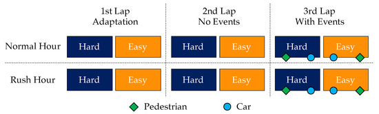 Summary of the experimental protocol. The experiment was carried out with two driving tasks which were different in terms of traffic (Normal and Rush hour) and performed in a randomized order. Each of the driving tasks were comprised of three laps: The 1st lap was intended to make the driver habituated to the circuit and the other (2nd and 3rd) laps were used for analysis. Moreover, events were introduced in the 3rd lap to assess the presence of different scenarios on road when there are absent and present respectively.