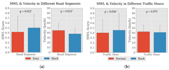 Average Mental Workload (MWL) score and velocity of nine participating drivers in different (a) Road segments and (b) traffic hours. The standard deviations are indicated, the p-values obtained from the two-sided Wilcoxon signed-rank tests are presented and significant values at 5% confidence interval are marked with asterisks (*).
