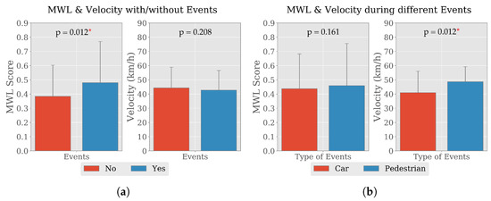 Average MWL score and velocity with standard deviation calculated from the data of nine participating drivers with respect to events. Sub-figure (a) illustrates the variation of MWL score and velocity with/without the presence of events and Sub-figure (b) illustrates the the effect of car and pedestrian on MWL score and velocity. The p-values obtained from the two-sided Wilcoxon signed-rank tests are presented and significant values at 5% confidence interval are marked with asterisks (*).