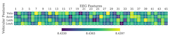 Considering all of the available vehicular features and the calculated features from EEG signal, MI values were calculated using Equation (7). The associated MI values, illustrated in Figure 5, demonstrates the shared knowledge between vehicular data and EEG data. Though the range of the MI values are not significant, yet they share some information, which leverages the motivation to use MI values in further classification or quantification of MWL in this work. Finally, an MI-based feature set was constructed using Equation (8). Table 2 represents the number of features from different feature sets which were considered in further stages of this study. Here, the prime concern of the study is to investigate the performance of MI-based features in MWL assessment and EEG features are used as an established objective measure reference.