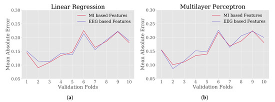 Four different prediction models LnR, MLP, RF and SVM were trained with expert defined MWL scores against EEG and MI based features. The performance of the models were validated with 10-fold CV approach. Figure 6 and Figure 7 illustrate the MAE values for 10 folds of validation sets in predicting MWL scores from EEG and MI based feature set. An overview of the prediction scores of each model on two different feature sets are provided in Table 4 from the performed CV.