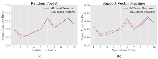 The 10-fold CV score in terms of MAE for regression models: (a) Random Forest (RF) and (b) Support Vector Machine (SVM), where the expert derived MWL scores were considered as true values. For each of the models, two different sets of features were used (Table 2).