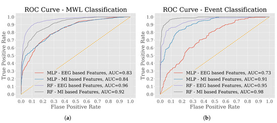 ROC curves associated with Area Under the Curve (AUC) values, for both of the classification tasks are illustrated in Figure 8. The ROC curves were drawn for the holdout test set. In both of the tasks, from the overall perspective, RF classifier outperformed other classifiers with both feature sets in terms of AUC values. Specifically, in MWL classification, the accuracy was higher for using EEG-based feature set but in event classification MI-based feature set produced higher AUC value.