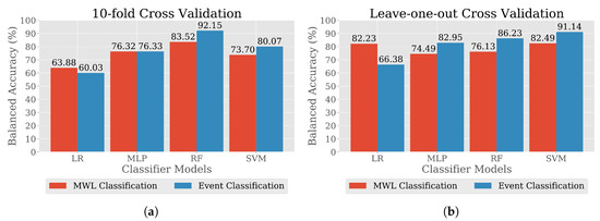 Primarily, the MI-based feature set was tested in MWL classification against the EEG-based feature set with the respective models described in Table 3. For MWL classification, the Low MWL was considered a positive class and High MWL was considered a negative class. In addition to MWL classification, the event classification tasks were performed to establish the use of MI-based features in other classification tasks, which was inspired from the result obtained in MWL classification. In event classification, Car and Pedestrian events were defined as the positive and negative classes, respectively, to measure the performance. For both the classification tasks, 10-fold CV and LOO-subject CV were used to train the models on different feature sets. The models used in MWL classification were used to train with the labels of events keeping the model parameters unchanged with a view to conduct comparative assessment.