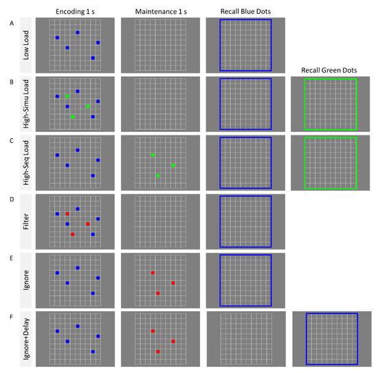 Example of conditions in Experiment 1. In the Low-Load condition (A) participants encoded blue dots and later reproduced them by clicking on the corresponding grid cells. In High-Simultaneous Load (B) and High-Sequential Load (C) conditions, participants encoded both blue and green dots. In the Filter condition (D), participants encoded the blue dots while ignoring the red dots presented at encoding. In the Ignore condition (E), participants encoded first the blue dots and ignored the red dots presented during the maintenance phase. In the Ignore+Delay condition (F) the recall test was presented after an additional delay of 1000 ms.