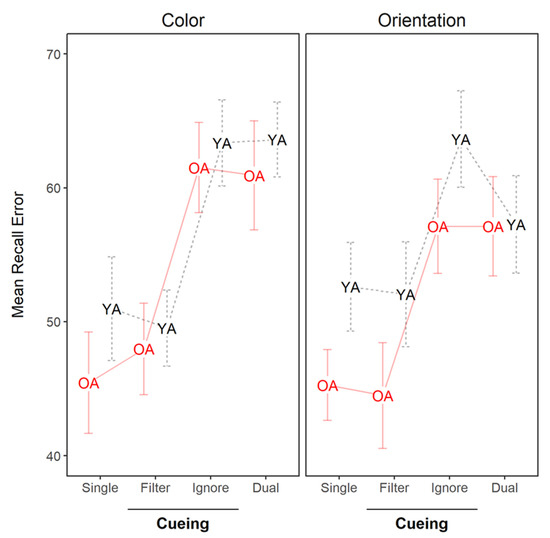 Mean recall error in Experiment 2 for each age group (YA = younger adults, OA = older adults), recall (color and orientation), and baseline condition (Single and Dual) and cueing condition (Filter and Ignore).