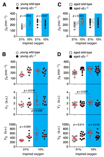 Figure 2. Respiratory responses of αβγ−/− mice to hypoxia. (A,B) Group data from whole-body plethysmography measurements of respiratory rate (ƒR), tidal volume (VT), and minute ventilation (VE) of unrestrained young wild-type and αβγ−/− mice in room air (21% O2) and moderate hypoxia (10% O2). (C,D) Summary data from whole-body plethysmography measurements of breathing parameters (ƒR, VT, VE) of aged wild-type and αβγ−/− mice in 21% and 10% O2. p—Wilcoxon matched-pairs signed-rank test (A,C), middle panels in (B,D); Mann–Whitney U rank test (lower panels in (B,D)).