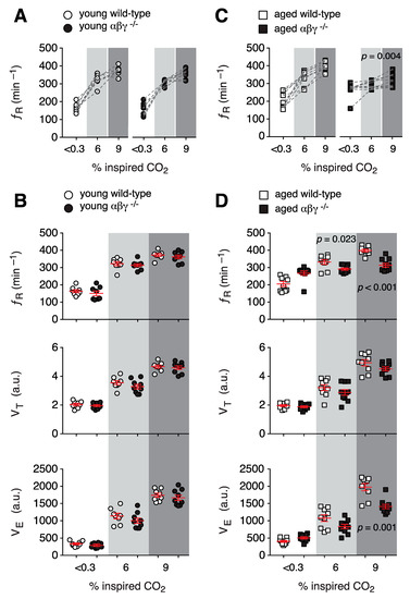 Figure 3. Respiratory responses of αβγ−/− mice to hypercapnia. (A,B) Group data from whole-body plethysmography measurements of respiratory rate (ƒR), tidal volume (VT), and minute ventilation (VE) of unrestrained young wild-type and αβγ−/− mice in < 0.03% CO2, mild (6% CO2), and moderate hypercapnia (9% CO2). (C,D) Summary data from whole-body plethysmography measurements of breathing parameters (ƒR, VT, VE) of aged wild-type and αβγ−/− mice in < 0.03%, 6%, and 9% CO2. p—Wilcoxon matched-pairs signed-rank test (C); Mann–Whitney U rank test (D).