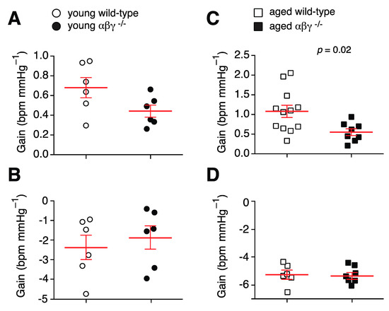 Baroreflex sensitivity was assessed over a range of blood pressure changes from −30 to +50 mmHg (Figure 4). No significant differences in either the pressor or the depressor reflex were detected in the young animals between genotypes (Figure 4A,B). In aged animals, the pressor reflex was found to be significantly attenuated in αβγ−/− subjects (1.1 ± 0.2 (n = 12) vs. 0.6 ± 0.1 bpm mmHg−1 (n = 8) compared to aged wild-type mice; Figure 4C, p = 0.02, Mann–Whitney U rank test). However, there was no difference found (p = 0.84; Mann–Whitney U rank test) in depressor reflex gain between aged αβγ−/− and aged wild-type animals (−5.3 ± 0.3 (n = 6) vs. −5.3 ± 0.3 bpm mmHg−1 (n = 6, Figure 4D)).