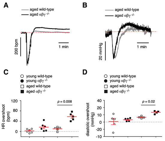 Figure 5. Heart rate and diastolic blood pressure restoration in αβγ−/− mice. (A) Example trace showing heart rate after activation of the depressor reflex in aged wild-type and αβγ−/− mice. (B) Example trace showing diastolic blood pressure after activation of the pressor reflex in aged wild-type and αβγ−/− mice. (C) Combined data showing maximum change (overshoot) in heart rate above baseline after activation of the depressor reflex in aged, young wild-type and αβγ−/− mice). (D) Combined data showing maximum change in diastolic blood pressure above baseline after activation of the pressor reflex in aged, young wild-type and αβγ−/− mice. Means ± S.E.M were compared with a Mann–Whitney U rank test.