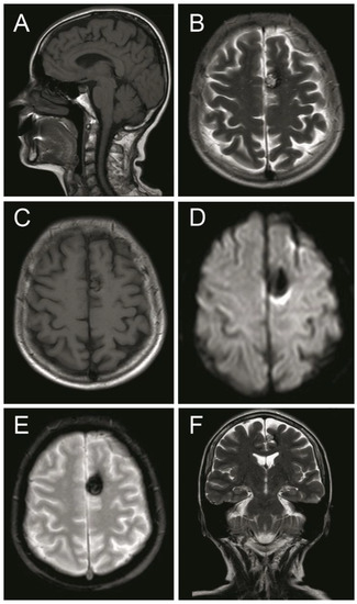 Magnetic resonance image (MRI) sequences showed a left parasagittal cavernoma with a hemosiderin component. (A) MRI T1 weighted—sagittal projection. (B) MRI T2 weighted—axial projection. (C) MRI T1 weighted post Gadolinium—axial projection. (D) MRI Diffusion-weighted—axial projection. (E) MRI Gradient echo—axial projection. (F) MRI T2 Flair weighted—coronal projection. See the text for detailed description.