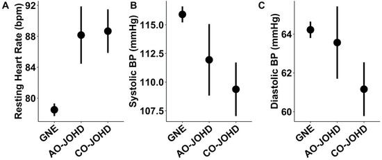 The mean rHR of participants with adolescent-onset JOHD (87.79 ± 3.72 bpm) was significantly elevated compared to the GNE group (78.50 ± 0.83 bpm; t = 2.44, p = 0.016). The childhood-onset JOHD group had a mean rHR of 89.12 ± 3.11 bpm, which was also significantly elevated relative to the GNE group (t = 3.27, p = 0.001). The childhood-onset and adolescent-onset JOHD groups did not differ significantly from one another (p = 0.786) (Figure 1a). The mean SBP of participants with adolescent-onset JOHD was 111.79 ± 3.14 mmHg compared to 116.00 ± 0.71 in the GNE group (t = −1.30, p = 0.195). There was a significant difference between the childhood-onset JOHD group and the GNE groups, though. Specifically, the childhood-onset group’s mean SBP was 108.66 ± 2.63 mmHg (t = −2.66, p = 0.0084). The difference between the childhood-onset and adolescent-onset groups was not statistically significant (p = 0.451) (Figure 1b). The mean DBP of the GNE group was 64.26 ± 0.43 mmHg. The adolescent-onset group’s mean DBP was lower (63.11 ± 1.84 mmHg) compared to the GNE group, but not significantly so (t = ‒0.609, p = 0.543). However, the childhood-onset JOHD group’s mean DBP was significantly lower (60.99 ± 1.55 mmHg) compared to the GNE group (t = −2.01, p = 0.045) (Figure 1c).