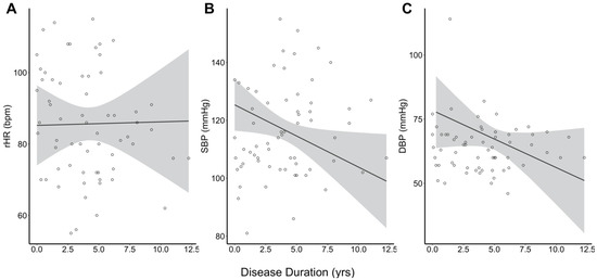 (A) Disease duration among patients with JOHD did not significantly predict rHR. (B) Systolic BP and (C) diastolic BP become significantly more decreased as disease duration increased in the JOHD group. Bpm: beats per minute; DBP: diastolic blood pressure; rHR: resting heart rate; SBP: systolic blood pressure.
