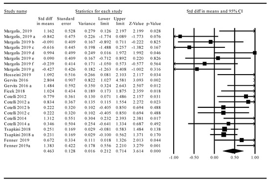 Analyses were conducted using the Comprehensive Meta-Analysis software (CMA version 3.0; www.meta-analysis.com). All analyses used a random effects model approach, which takes into account study variability (heterogeneity) due to differences in methods and sample characteristics, as well as the small number of studies included in the meta-analysis; this approach relies on the assumption that observed treatment effects can vary due to real differences in the effect within each study, as well as from sampling variability or chance [63]. The main outcome measure, the accuracy on language assessments, was defined as the mean rate of correct responses (e.g., naming stimuli or correct number of oral, written/spelling units). The computed outcomes (effect sizes) were calculated based on the mean difference scores between active versus sham groups from baseline to post-intervention. For studies with no sham arm, the effect size was calculated using the mean difference score from the active stimulation groups’ baseline to post-intervention; scores were standardized by calculating Cohen’s d, which is the difference between two raw means divided by the pooled standard deviation (SD). When the mean and SDs were not available, d was calculated from reported univariate F-tests, t-statistics, or p-values. Effect sizes were classified similar to previous conventions as small (d ≥ 0.20), medium (d ≥ 0.45), or large (d ≥ 0.80) [64]. Confidence intervals (CIs) and z-transformations of the effect size were used to determine if the statistical significance (p < 0.05) was reached. Significance was achieved for mean effects within the 95% CI that did not span zero; this criterion provides strong evidence that, on average, the treatment effect is beneficial [63]. To explore how much of the total variability could be attributed to heterogeneity among studies, the Cochran Q-statistic was used [65]. Cochran’s Q-statistic computes the sum of the squared deviations of each study’s estimate from the overall meta-analysis estimate. This test enabled determination of whether there were genuine differences underlying the results of the included studies (heterogeneity) or whether a variation in findings was due to chance alone (homogeneity) [66]. The following data assignments were used across the 22 examined effects: Paired groups (difference, p), Paired groups (N, t-value), Paired groups (means, p), Independent groups (means, p), Raw difference paired (SE).