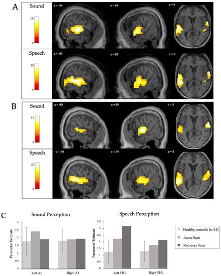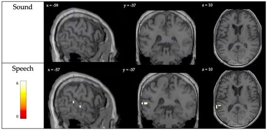 - Binder, J.R.; Frost, J.A.; Hammeke, T.A.; Bellgowan, P.S.F.; Springer, J.A.; Kaufman, J.N.; Possing, E.T. Human Temporal Lobe Activation by Speech and Nonspeech Sounds. Cereb. Cortex 2000, 10, 512–528. [Google Scholar] [CrossRef] [PubMed]