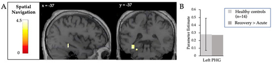 | Spatial Navigation | Left parahippocampal gyrus | −37, −37, −25 | 4 | 3.96 |