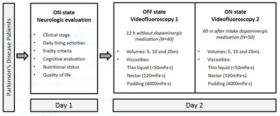This cross-sectional observational comparative two-day study to assess OD pathophysiology in early PD stages included 50 PD patients: 40 patients were assessed in both OFF state (12 h without their dopaminergic medication) and ON state (60 min after dopaminergic medication), in other words, the time required for maximum plasma concentration; 10 patients were assessed in ON status but rejected to stop their daily dopaminergic treatment. The dopaminergic medication was prescribed by the patient’s neurologist at the usual dose. The experimental protocol was as follows (Figure 1): Healthy volunteers (HV, N = 12) underwent only one videofluorocopy (VFS) because they were not taking any dopaminergic medication.