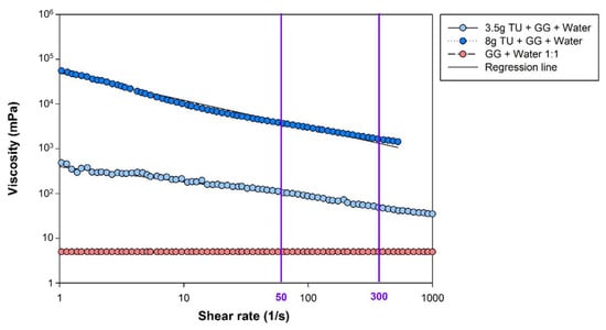 Regression lines for 120 mPa·s and 4000 mPa·s viscosity in a shear rate range from 0 s−1 to 1000 s−1 were f (3.5g) = −0.20x + 2.28 (r2 (3.5g) = 0.77) and f (8g) = −0.61x + 4.69 (r2 (8g) = 0.977), respectively. Viscosity values at the pharyngeal shear rate (300 s−1) were extrapolated from the regression lines [42], achieving a value of 57.93 mPa·s and 1474.90 mPa·s for 120 mPa·s and 4000 mPa·s, respectively (Figure 2).