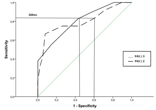 ROC curve analysis of LVC time was used to predict unsafe swallow for 5 mL of the 120 mPa·s (Figure 3). Considering unsafe swallow as a PAS score ≥ 3, the optimal LVC time cut-off value to predict unsafe swallow was ≥260.00 ms, for sensitivity = 0.83, specificity = 0.39, and AUC = 0.80 (95% CI: 0.68–0.92) (Figure 3). When a PAS score ≥2 was considered, the optimal LVC time cut-off value to predict unsafe swallow remained at ≥260.00 ms, for sensitivity = 0.83, specificity = 0.57, and AUC = 0.80 (95% CI: 0.63–0.97).
