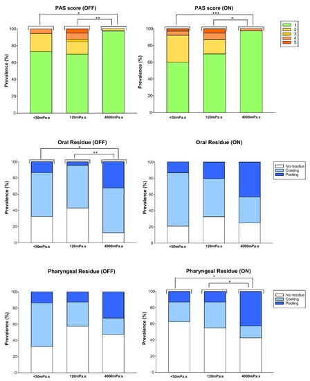 Prevalence of safe swallowing and penetration (PAS score) and oral and pharyngeal residues for three bolus viscosities (<50 mPa·s, 120 mPa·s, and 4000 mPa·s) in the OFF and ON states. OFF p-values * <0.05 and ** <0.01; ON p-values * <0.05 and *** <0.001.