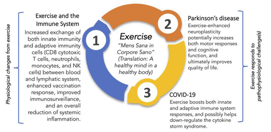 An overview of some health benefits of exercise by modulation of the immune system and putative protective roles for exercise in encounters with Parkinson’s disease and SARS-CoV-2. Juvenal’s centuries-old dictum to seek a healthy mind in a healthy body is from [42].