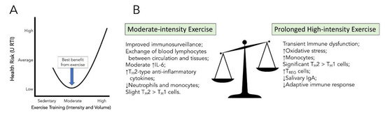 Both cross-sectional and longitudinal data have shown that individuals who participate in moderate-intensity exercise self-report less upper respiratory tract infections (URTI). Additionally, in animal models, those exposed to moderate-intensity exercise before symptom presentation have lower rates of mortality [48,49]. A prospective study in humans assessing the dose–response relationship between moderate walking/running energy expenditure and pneumonia, respiratory disease, and aspiration pneumonia mortality, found that higher doses of moderate exercise decreased mortality in all three categories [50]. In contrast, many studies have shown that prolonged high-intensity aerobic exercise leads to increased death from a viral respiratory infection and over suppression of the immune response [51,52,53]. These findings have led to the development of the ”J-shaped” hypothesis that articulates this balance between exercise dose and URTI risk (Figure 3).