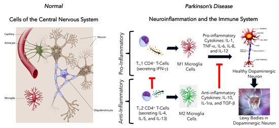 Aspects of both the innate and adaptive immune systems are active in PD, and they contribute to the pathogenesis of the disorder [67,68]. In the periphery, circulating monocytes, tissue macrophages, and dendrites have an essential role in maintaining the body’s cellular environment through phagocytosis, antigen processing and presentation, and the production of cytokines and chemokines [47]. The CNS monocyte equivalent is the microglia cell, the resident innate immune cells of the brain [67]. There are two subsets of microglia cells: the M1 pro-inflammatory phenotype and the M2 anti-inflammatory phenotype.
