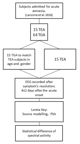 To achieve this goal, we used PSA empowered by exact low-resolution brain electromagnetic tomography (eLORETA) of standard clinical EEGs [15] to study spectral features of the EEG of patients with TEA compared to those with TGA. The use of source reconstruction techniques allowed us to project spectral activity on a brain template, allowing us to reach a deeper functional interpretation.
