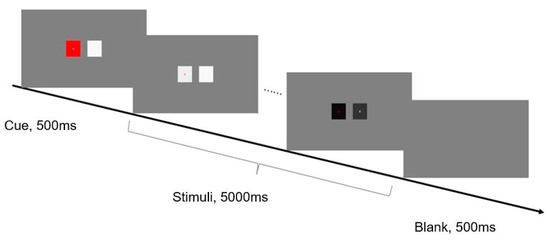 An example sequence of displays in a typical trial of Experiment 1. The experimental stimuli were two squares presented in the center of the screen. Each trial started with a 500 ms cue phase. In this stage, the two squares were at rest, one of which was red (target) and the other was white. Then, the luminance values of two squares were respectively modulated by sinusoidal coding at different frequencies, e.g., alternated from black and white, and they flashed for 5 s. Between trials, an empty screen was presented for 500 ms. Participants were required to pay attention to the red square, where the center letter was the object of fixation.