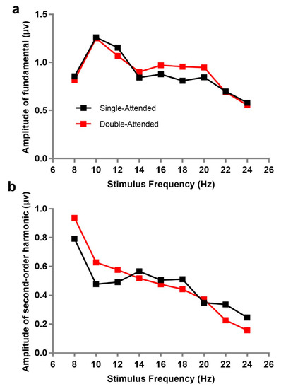 Amplitude change with stimulus frequency under single-attended and double-attended conditions: (a) amplitudes of fundamental, and (b) amplitudes of second-order harmonic. The horizontal axis shows the flickering frequency of the stimulus and the vertical axis shows the amplitudes corresponding to the stimulus frequency at the fundamental (a) and the second-order harmonic (b). Single-attended refers to only one stimulus flashing in the central field of vision (as a comparison); double-attended means the target stimulus (attended) was paid attention to while another flashing stimulus was presented simultaneously.