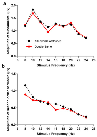 Additionally, we analyzed the spectrum of SSVEPs under other two attention conditions, double-same and attended + unattended. Double-same (co-frequency) refers to two stimuli flashing simultaneously at same frequency, which cannot be separated from the frequency spectrum; in other words, the amplitude of SSVEP under the double-same condition was the sum of responses evoked by attended and unattended stimuli. Similarly, the amplitude of attended + unattended was the sum of responses of double-attended and double-unattended (double-attended corresponding to the attended stimulus when two flashing stimuli were presented simultaneously; while double-unattended, on the contrary, corresponds to the unattended stimulus in the case). Figure 3 describes the amplitude trend of fundamental or second-order harmonic frequencies as a function of stimulus frequency under the double-same and attended + unattended conditions. A 9 × 2 repeated within-subjects analysis of variance (ANOVA) with each stimulus frequency (8, 10, 12, 14, 16, 18, 20, 22, and 24 Hz) and attention condition (double-same, attended + unattended) on the fundamental and second-order harmonic, respectively, was also performed. The results showed that there was no significant difference of SSVEP responses between double-same and attended + unattended conditions under the fundamental (F(1, 10) = 0.347, p = 0.569, ƞp2 = 0.034), but a similar trend failed to appear under second-order harmonic (F(1, 10) = 9.637, p = 0.011, ƞp2 = 0.491). This illustrates that the amplitudes of fundamentals in double-same were not significantly different from the sum of double-attended and double-unattended.