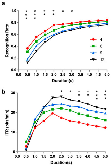The performance of SSVEP-based brain–computer interface (BCI) for different numbers of stimuli and time lengths: (a) recognition rate, and (b) information transfer rate (ITR). The asterisk “*” indicates a significant difference among different stimulus numbers (i.e., * p < 0.05, ** p < 0.01, *** p < 0.001).