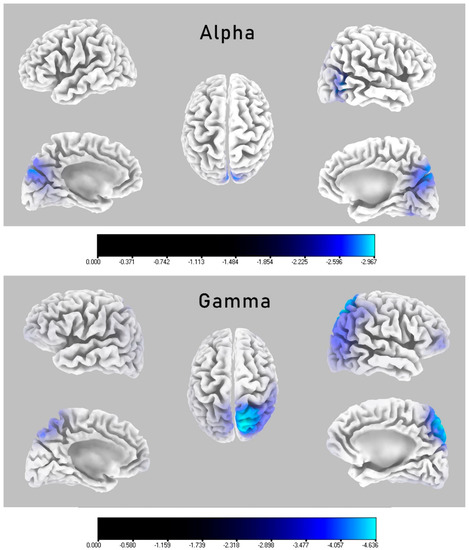 Quantitative results of a between-group comparison regarding the current source density values in the alpha and gamma frequency bands that differentiated the groups.