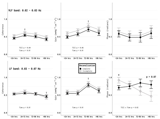 Patients with incomplete (TICI 2a/b) recanalization had significantly higher infarct volumes at 24 h and lower early neurologic recovery (p < 0.01) compared with patients with complete (TICI 3) recanalization (Table 1). The infarct volume may have also been related to cerebral autoregulation. In fact, when dichotomized into small (<70 mL) and large (>70 mL) infarcts, which used a cut-off volume chosen based on the stroke volumes used to determine patients eligible for a thrombectomy over extended time windows (as used in the Diffusion and Perfusion Imaging Evaluation for Understanding Stroke Evolution (DEFUSE 3) study [35]), larger stroke volumes (>70 mL) were associated with a higher coherence and a lower phase on the ipsilateral side within the VLF band (time × infarct size effect p < 0.01 for coherence and p = 0.01 for gain) and LF bands (time × infarct size effect p = 0.01 for coherence) (also see Table 2 for the differences across all time points). To account for these differences, we used the infarct size (small vs. large) as a covariate in our statistical analyses below.